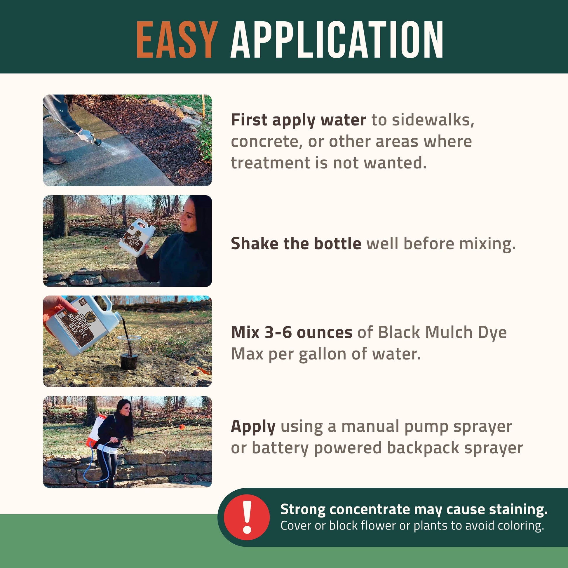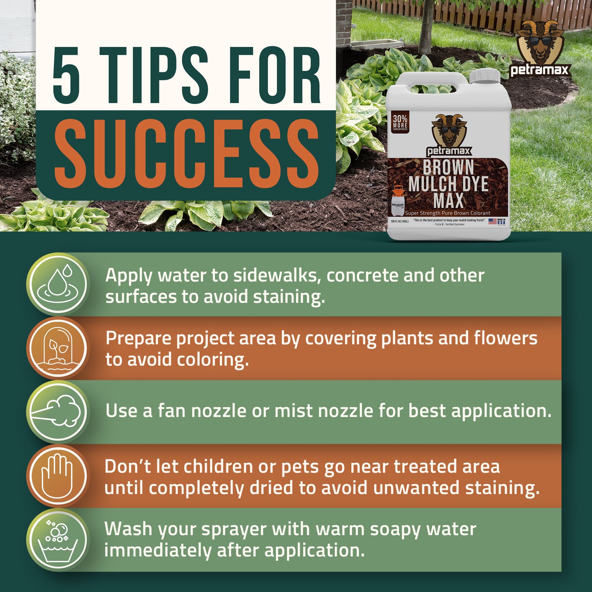 This commercial-grade brown mulch colorant refreshes faded, weathered mulch and helps create sharp, well-defined landscape borders that actually stand out. The highly concentrated brown color spray for mulch delivers long-lasting results for up to seven months. Advanced pigment binders make this mulch colorant spray water-resistant, so the color holds up against sun exposure, rain, and regular watering. This brown mulch dye concentrate works on both organic and inorganic materials, including pine straw, mulch chips, and rubber garden mulch, and restores original color within seconds of application.
